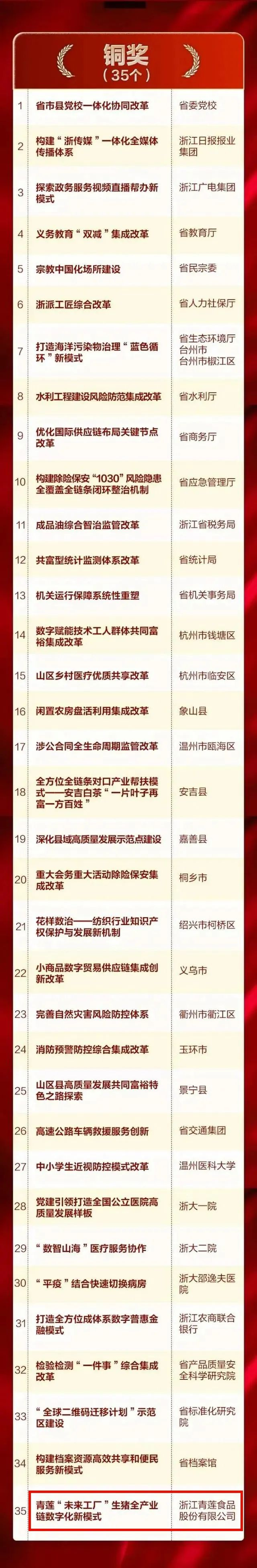 重磅!青蓮食品—膳博士榮獲浙江改革突破獎(jiǎng)銅獎(jiǎng)! 2023-02-01 09:20:19 浙江青蓮食品股份有限公司 瀏覽次數(shù) 2124 近日,浙江省委改革辦公布了2022年度浙江省改革突破獎(jiǎng)名單。浙江青蓮食品股份有限公司“數(shù)智青蓮”未來工廠榮獲2022年度浙江省改革突破獎(jiǎng)銅獎(jiǎng),是銅獎(jiǎng)組中唯一的一家民營企業(yè)。20多年來,青蓮食品構(gòu)建起從農(nóng)場到餐桌的透明全產(chǎn)業(yè)鏈,在改革創(chuàng)新中以種業(yè)為源頭,建立起未來農(nóng)場—未來工廠—產(chǎn)業(yè)新零售等數(shù)字化應(yīng)用,真正從用戶需求出發(fā)為社會提供優(yōu)質(zhì)食品!此次獲得浙江改革突破獎(jiǎng)銅獎(jiǎng),更是對青蓮食品數(shù)字化轉(zhuǎn)型成果的肯定和勉勵(lì)!實(shí)現(xiàn)黑豬專家膳博士在安全和美味雙升級上硬核突破!身為黑豬專家,膳博士服務(wù)過世博會、世乒賽、國際馬拉松比賽,連續(xù)8年為世界互聯(lián)網(wǎng)大會供肉,連續(xù)14年為中國極地研究中心供肉,成為杭州亞運(yùn)會官方生鮮肉類產(chǎn)品供應(yīng)商。以國家級嘉興黑豬和兩頭烏保種場作為種業(yè)基礎(chǔ)繁育國家級優(yōu)質(zhì)新品種,形成完整的黑豬商品體系為消費(fèi)者帶來舌尖體驗(yàn)。近年來,通過智慧養(yǎng)殖為傳統(tǒng)畜牧產(chǎn)業(yè)數(shù)字化轉(zhuǎn)型先行探路,以新一代信息技術(shù)為手段,重塑生豬全產(chǎn)業(yè)鏈生產(chǎn)組織方式和管理服務(wù)模式,構(gòu)建“1+4+N”模型,推動(dòng)全產(chǎn)業(yè)鏈數(shù)字化轉(zhuǎn)型。產(chǎn)業(yè)零售端以用戶需求為中心持續(xù)推出膳博士黑豬鮮肉鮮制系列產(chǎn)品提升消費(fèi)體驗(yàn),滿足國人對美好生活、品質(zhì)食品的向往。2022年,青蓮智慧牧場首批入選浙江省“未來農(nóng)場”,“數(shù)智青蓮”未來工廠獲全省數(shù)字化改革“最佳應(yīng)用”和全省數(shù)字經(jīng)濟(jì)系統(tǒng)“最佳應(yīng)用”。在全省數(shù)字化改革大會上做匯報(bào)演示,列入全省數(shù)字經(jīng)濟(jì)系統(tǒng)地方特色應(yīng)用目錄,受到央視、省級、市縣級等媒體持續(xù)關(guān)注報(bào)道。 上一條“風(fēng)云浙商”許明曙:人生把一件事做好就很不容易 下一條全國唯一!膳博士·香雪白豬獲2022年度國家新品種認(rèn)定!